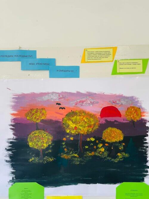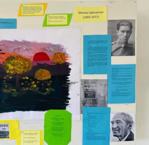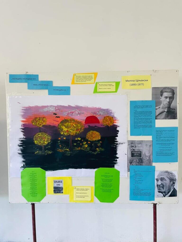 песама, издвајали цитате из романа и путописа, а упознали су се и са биографијом овог истакнутог писца. Како је уводна реченица првог Црњансковог романа приказ његовог доживљаја јесени, ученица Лола Туревски осликала је хамер мотивима који илуструју ово годишње доба.