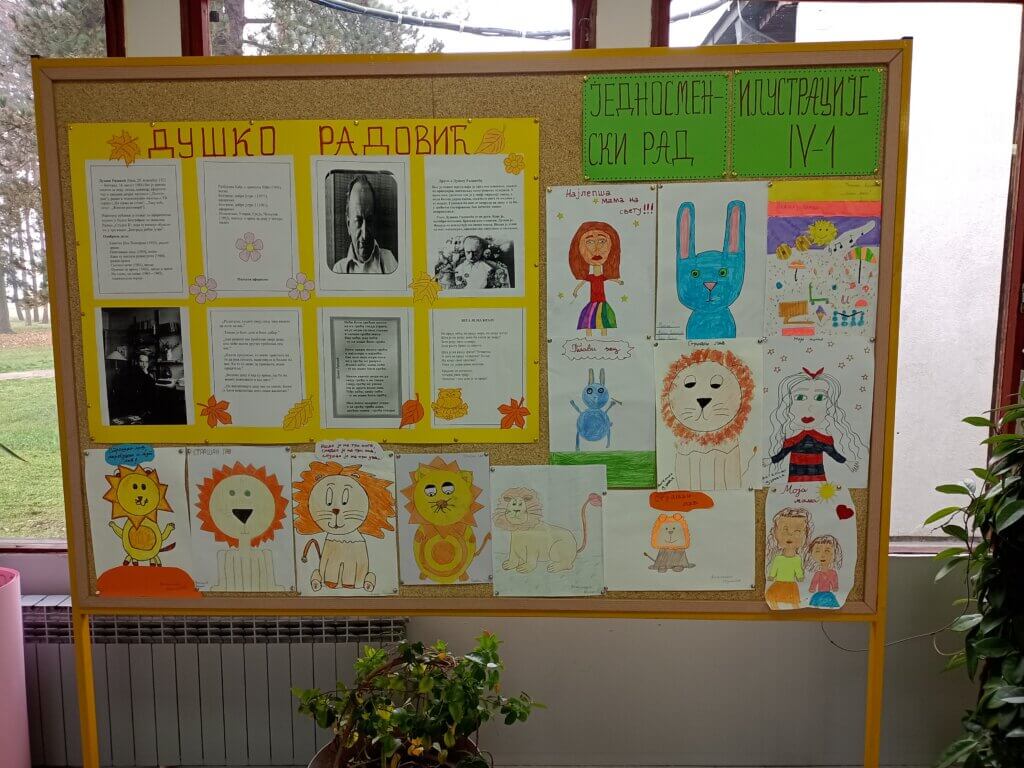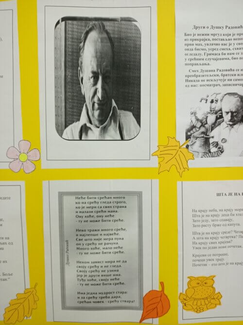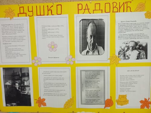 Поводом обележавања стогодишњице рођења нашег великог песника за децу Душка Радовића, наставница српског језика Ивана Бабић приредила је у холу школе пригодну изложбу. Ученици ће се подсетити ауторових најпознатијих збирки поезије, афоризама везаних за дечији свет и песама које се памте и онда кад одрастемо. Такође, на паноу су истакнути ликовни радови ђака четвртог разреда матичне школе.