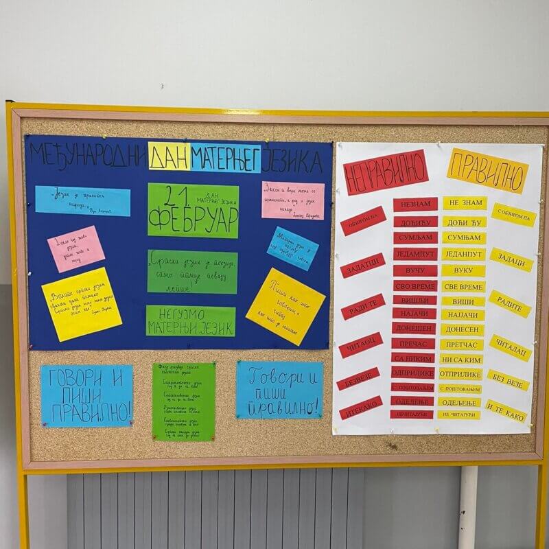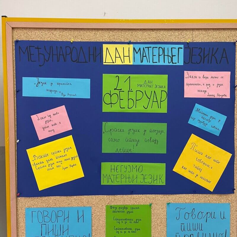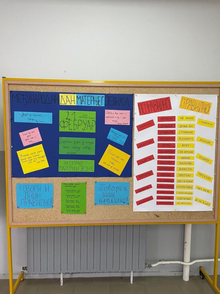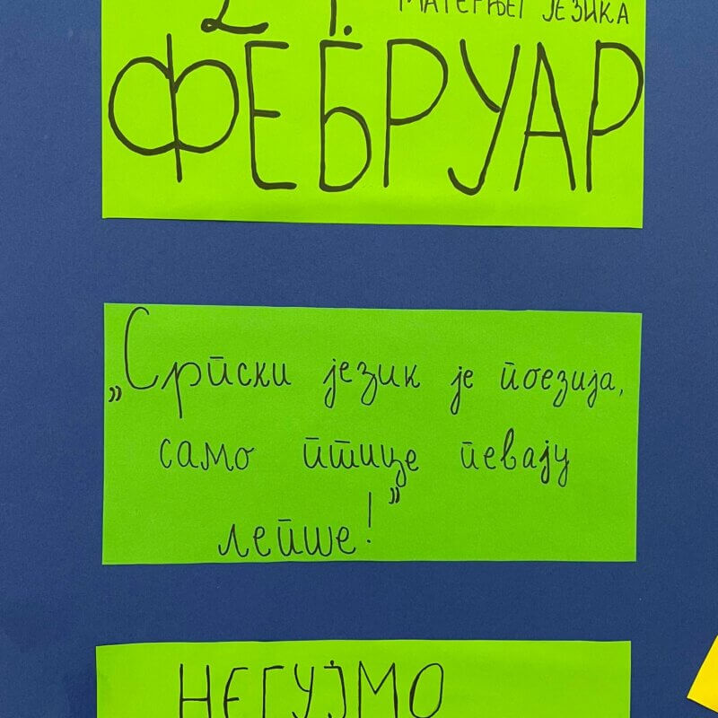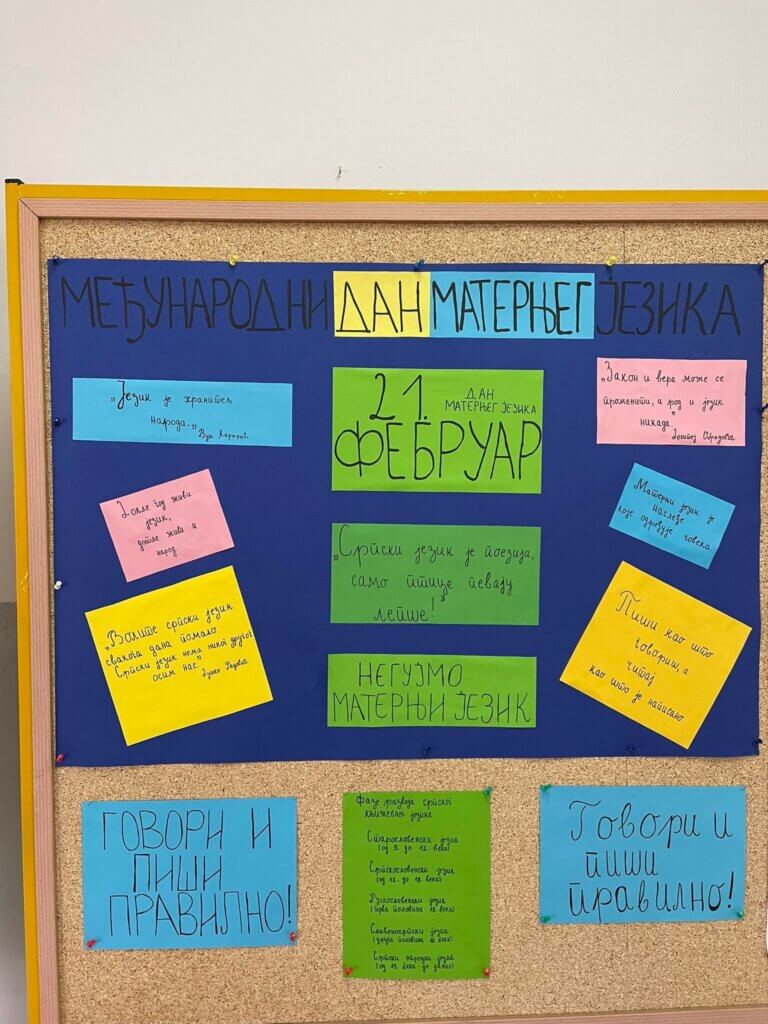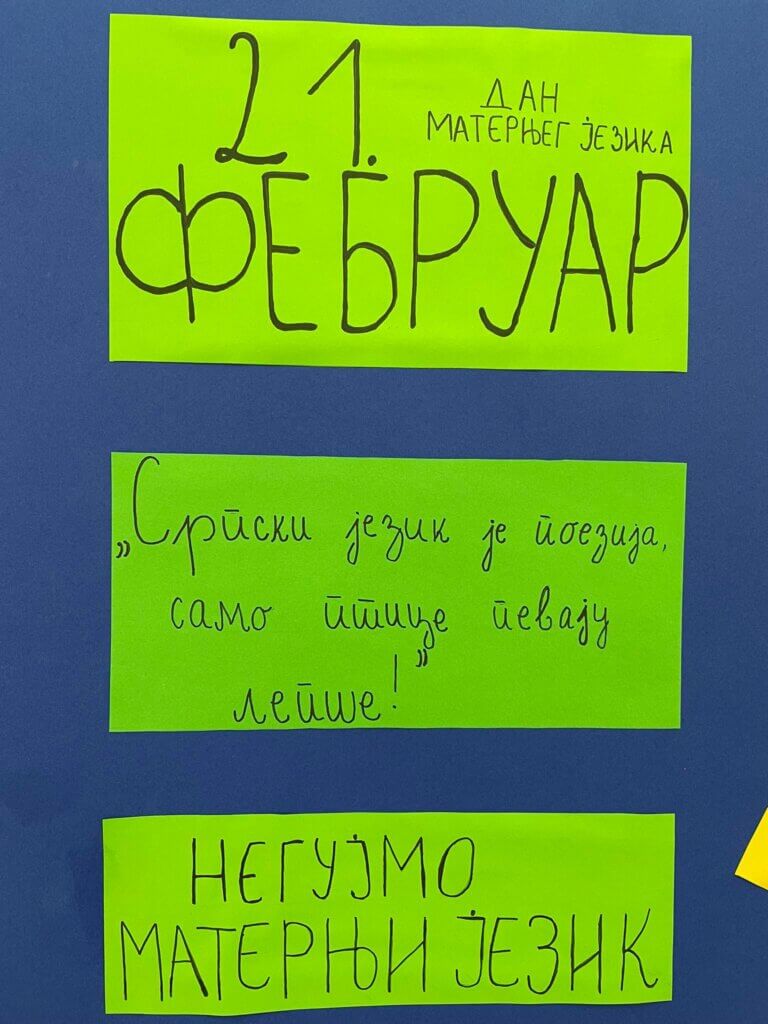 фебруара обележили смо Међународни дан матерњег језика. Порукама које су истакнуте у холу матичне школе, наставница српског језика, Драгана Танасковић, указала је ученицима на значај матерњег језика, као и на то зашто је битно изучавати га, неговати и чувати. Ученици могу прочитати неке од мисли истакнутих личности српске лингвистике и књижевности који су говорили о нашем језику и писму. Овога дана часови српског језика били су посвећени упознавању ученика са различитим занимљивостима везаним за матерњи језик.
