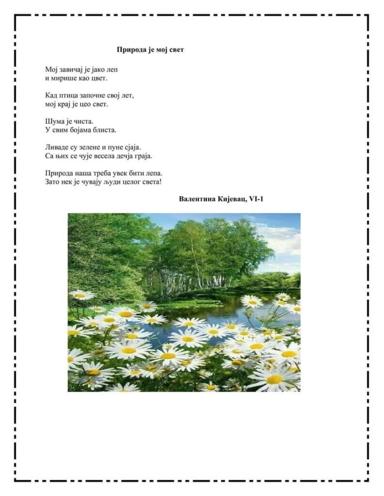 Дечији културни центар Београд објавио је 16. маја, на дан рођења наше велике песникиње Десанке Максимовић, резултате литерарног конкурса „Природа је мој свет“ који је био њој и посвећен. У категорији 7-8. разред, треће место освојила је наша ученица Лена Милановић, VIII-1, а у категорији 5-6. разред, похваљена је песма Валентине Кијевац, VI-1. Честитамо нашим малим песникињама и желимо им да крену Десанкиним путем!