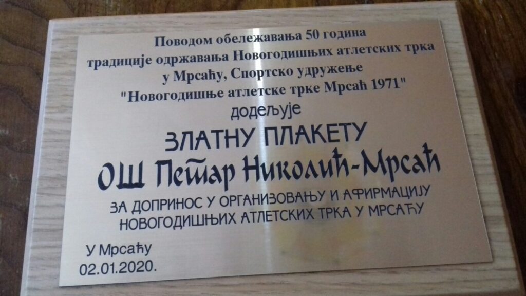 За посебан допринос у организацији и афирмацији новогодишњих атлетских трка, Спортско удружење „Новогодишње атлетске трке Мрсаћ 1971“, доделило је Основној школи „Петар Николић“, златну плакету.