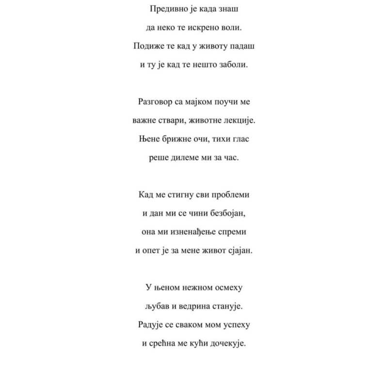 У организацији Дечијег савеза града Врања расписан је протеклог месеца литерарни конкурс под називом „Најлепша мама на свету, моја мама“. У великој конкуренцији, у категорији од петог до осмог разреда, наше две ученице освојиле су треће место. То су Анита Калајџић VIII-1 и Марија Минић VII-1. Овом приликом упућујемо им све честитке што на овако леп начин представљају своју школу у Србији!