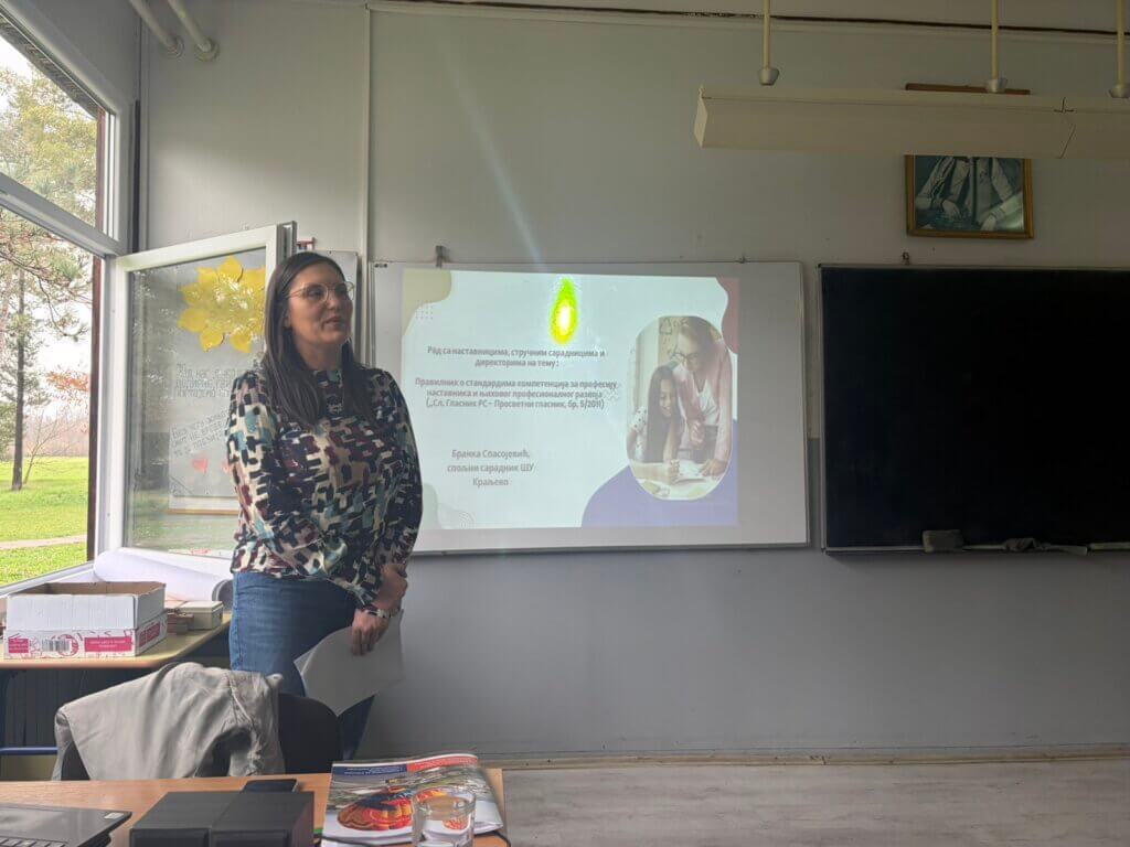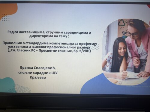 Предавање на тему „Правилник о стандардима компетенција за професију наставника и њиховог професионалног развоја“ одржала је Бранка Спасојевић, наставник – спољни сарадник Школске управе Краљево.