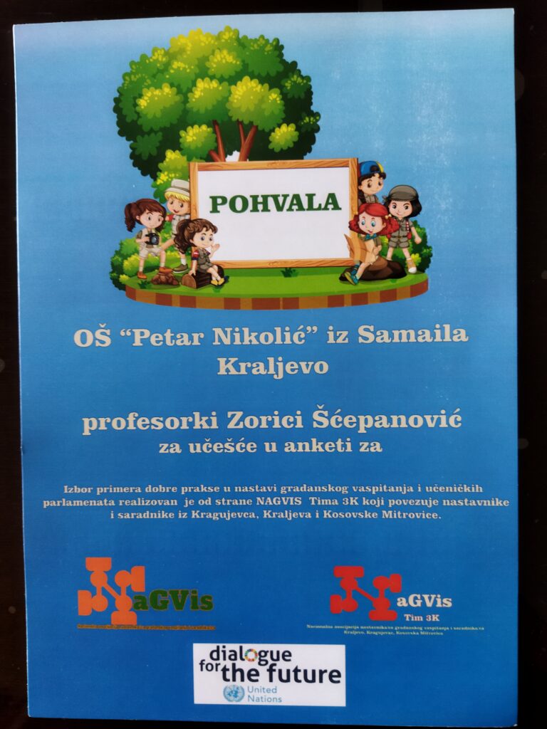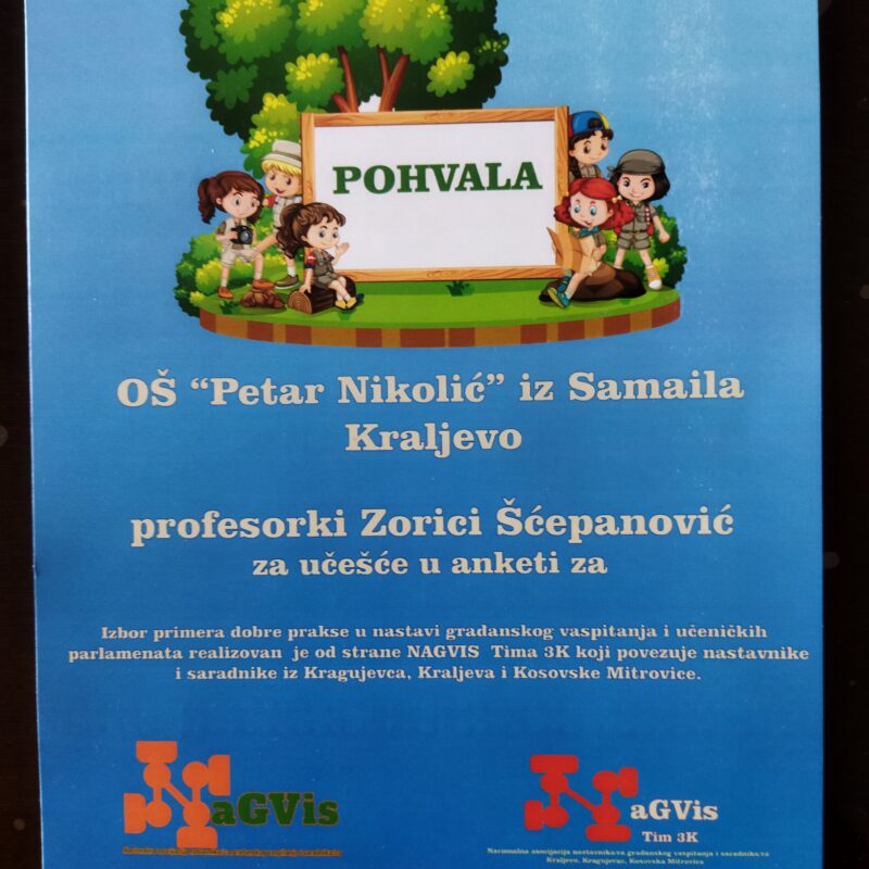 На Тв Мелосу и ТВ Краљеву у оквиру прилога о НАГВИС Тиму 3К који повезује наставнике и сараднике из Крагујевца, Краљева и Косовске Митровице, основна школа Петар Николић је похваљена за пример добре праксе у настави грађанског васпитања и ученичких парламената. Као пример добре праксе наведено је учешће у акцији Треш изазов где су ученици подстакнути светским акцијама сличне природе, изашли из својих школских дворишта и чистили село. Поред тога, још три примера добре праксе су објављена у брошури која садржи и примере из других школа.