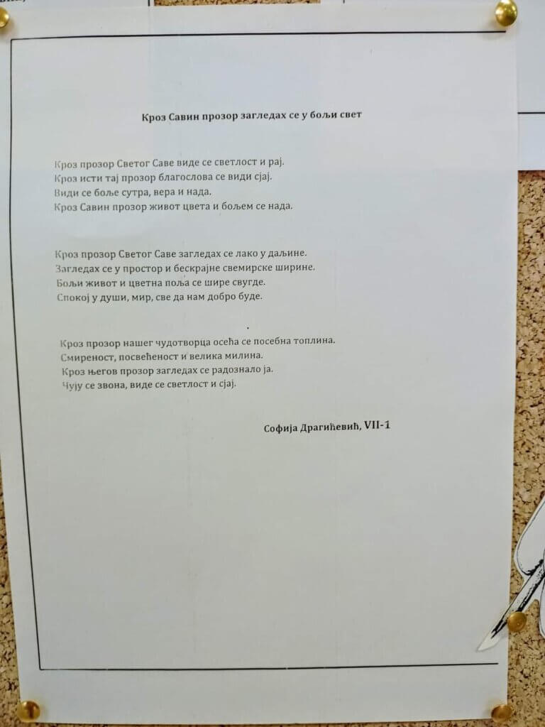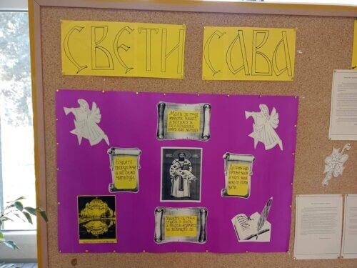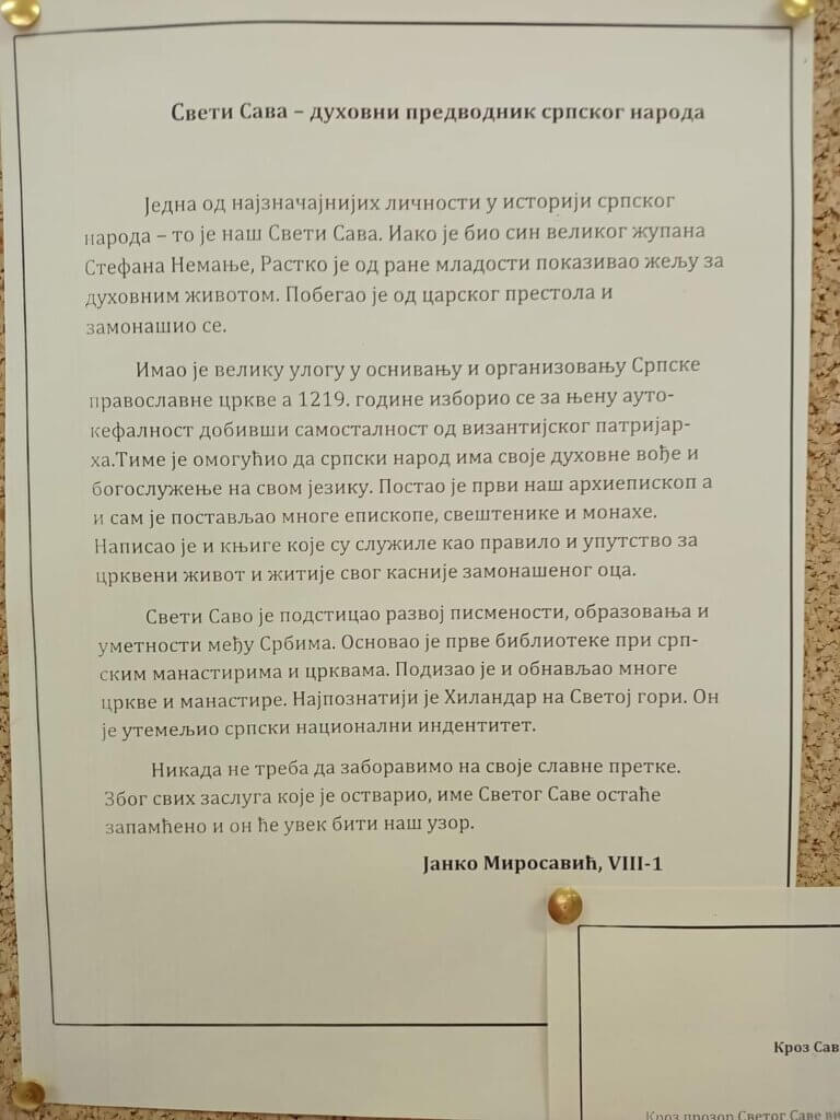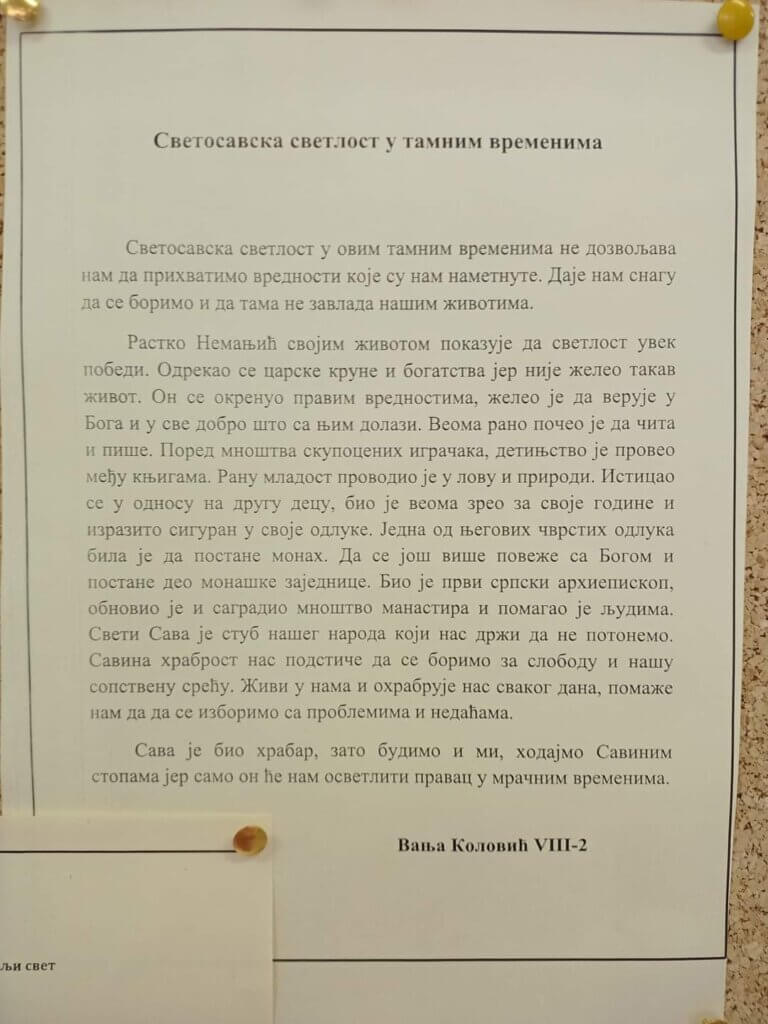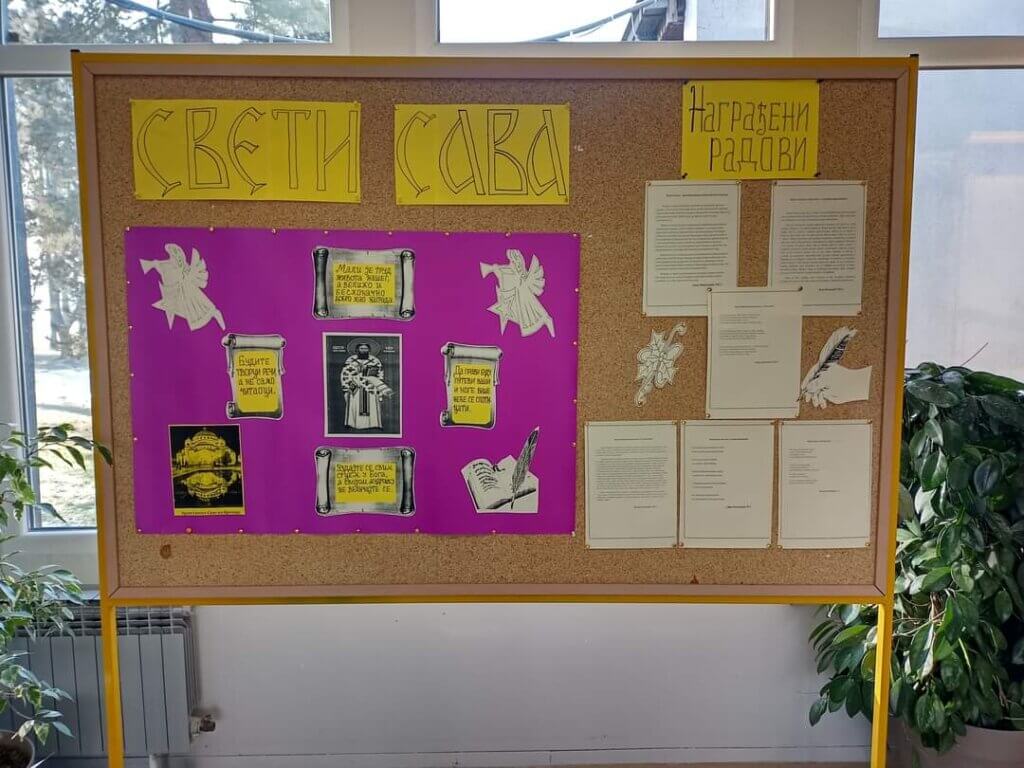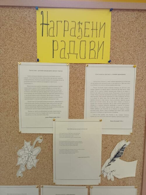 Поводом обележавања Дана Светог Саве, наше школске славе, наставница српског језика приредила је пригодну изложбу у холу матичне школе. Она се састоји из два дела – у једном су истакнуте одабране мисли и поуке нашег светитеља, а у другом су изложени награђени и похваљени поетски и прозни радови ученика који су учествовали на Светосавском литерарном наградном конкурсу. Аутори три најбоља из категорије виших разреда су: Јанко Миросавић, VIII-1, Вања Коловић, VIII-2 и Софија Драгићевић, VII-1. Честитамо им!