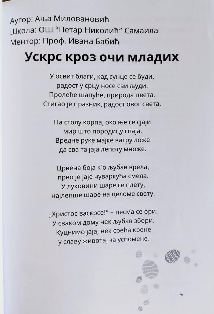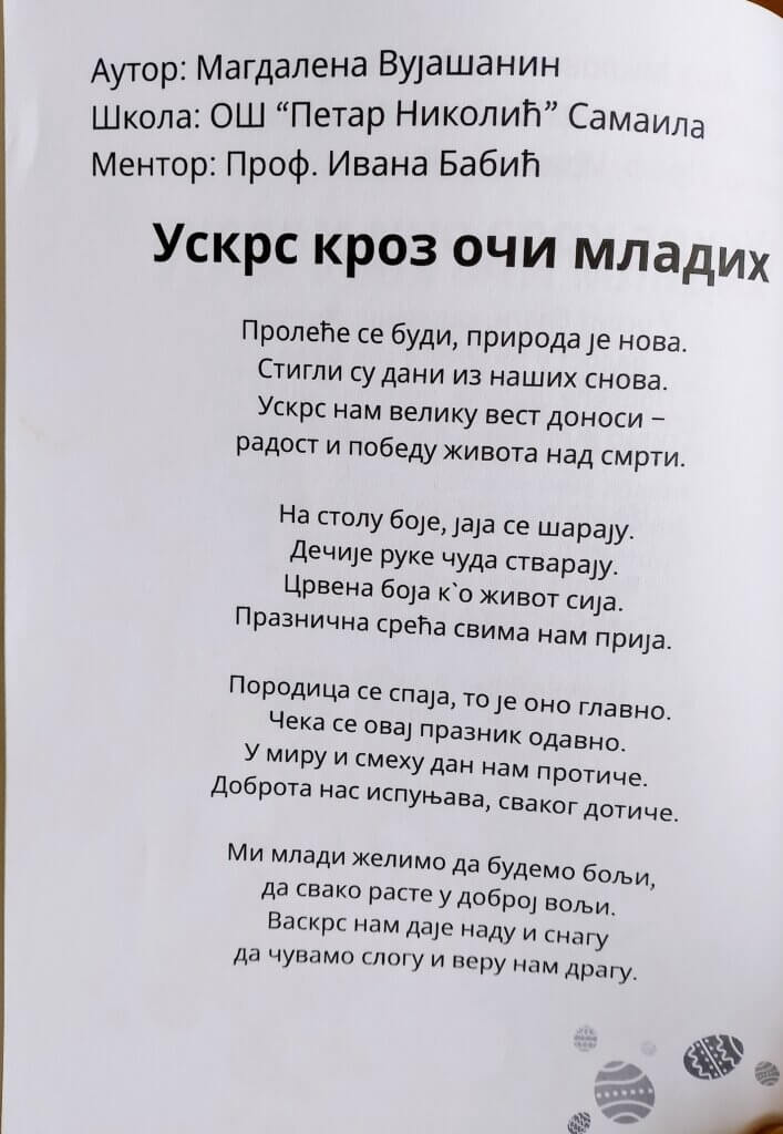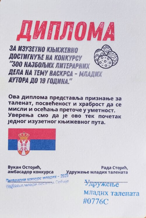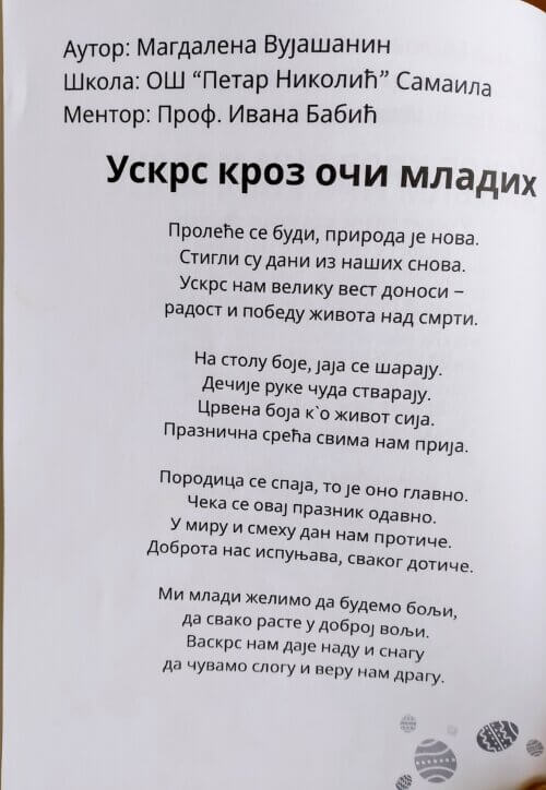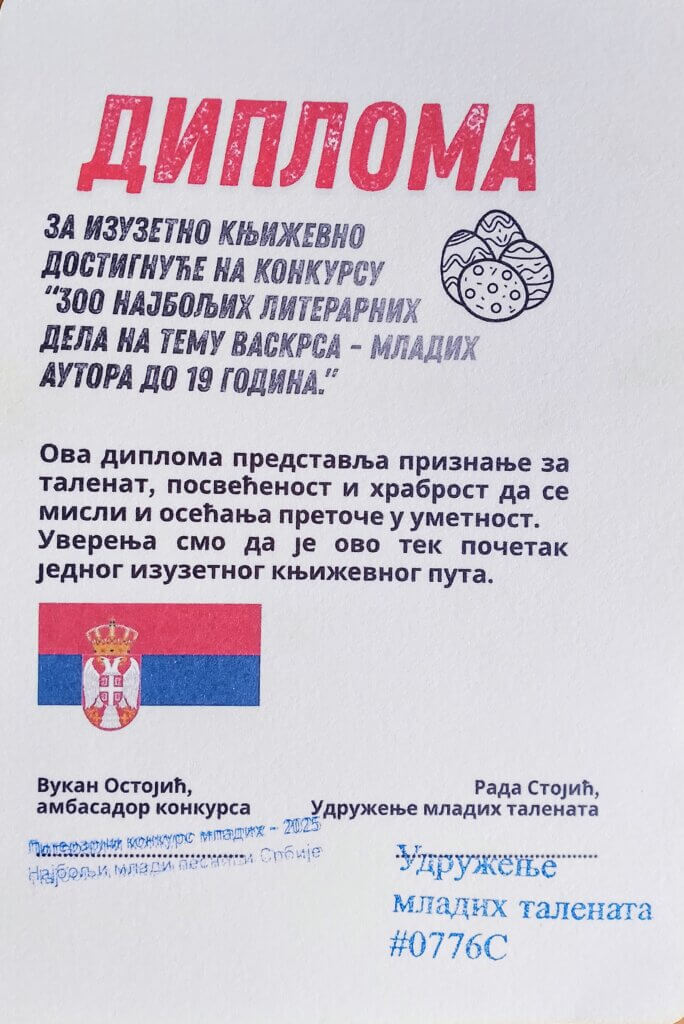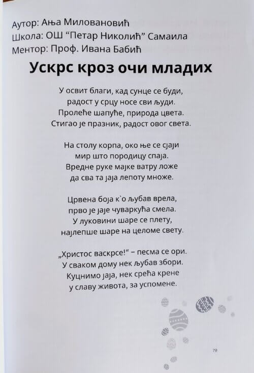 „Удружење младих талената“ из Ниша расписало је литерарни конкурс под називом „Ускрс кроз очи младих“ за ауторе до 19 година са територије целе Србије. Укупно 300 најлепших песама и састава објављено је у ускршњем издању „Зборника литерарних радова“.